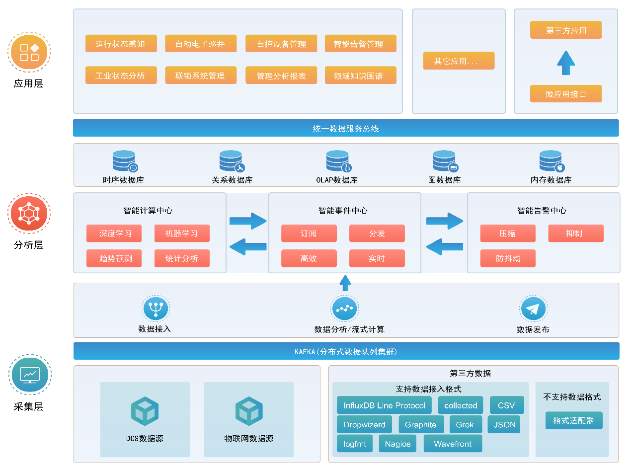 油氣田大數(shù)據(jù)智能分析軟件通過工業(yè)常用的通訊協(xié)議,對氣田井站、管道、儀表、附屬設施工業(yè)生產(chǎn)現(xiàn)場的進行在線分析和智能監(jiān)控,實現(xiàn)實時數(shù)據(jù)采集、在線診斷、一體化管理、風險提前預警、故障快速定位,輔助提升氣田生產(chǎn)運維人員工作效率,保障氣田生產(chǎn)穩(wěn)定運行。主要提供五大基礎功能,六項專業(yè)能力。
